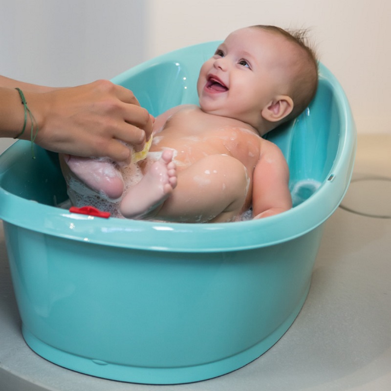Equipada com suporte entre pernas para que o bebé sinta-se confortável e seguro no banho.