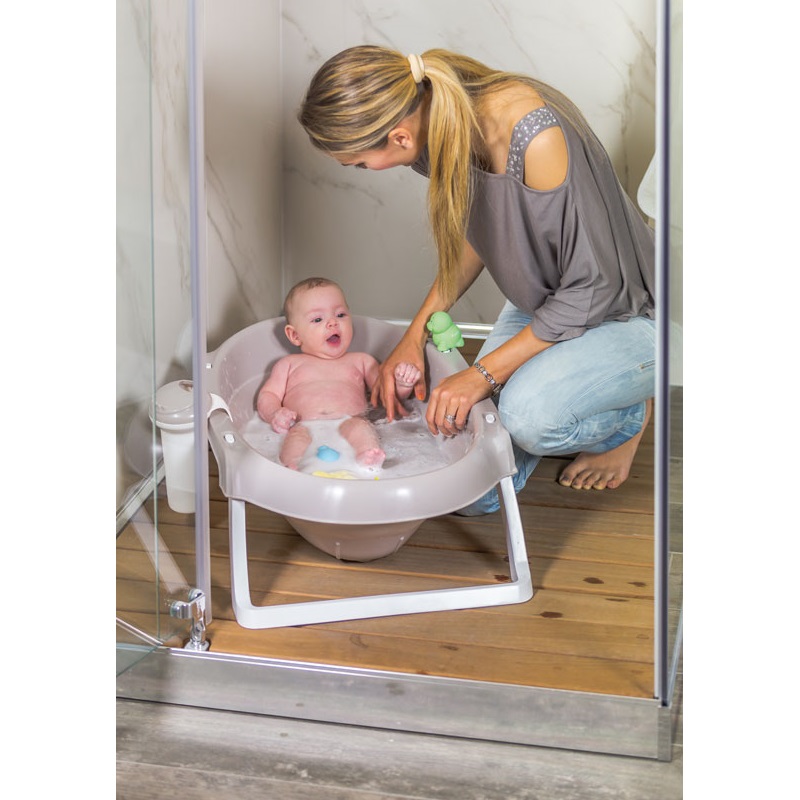 A banheira está equipada com um ponto de repouso assimétrico entre as pernas, para permitir a sua utilização dos 0 aos 6 meses (bebé deitado) ou dos 6 aos 12 meses (bebé sentado), e ser livre para mover os braços e as pernas.