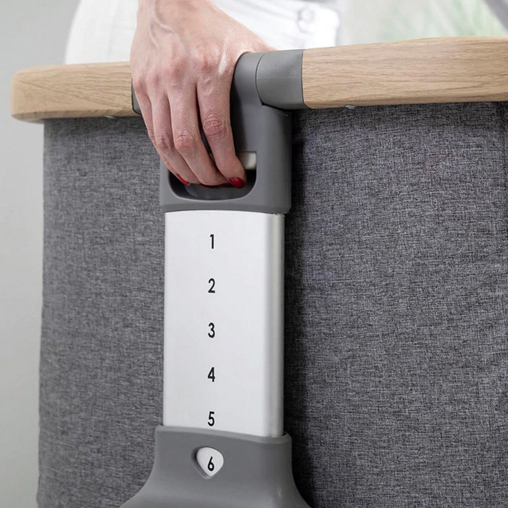 O ajustador de altura de 6 degraus e as alças ajustáveis fornecidas permitem que o berço Tutto Bambini CoZee seja instalado em qualquer cama (altura máxima do colchão 58cm).