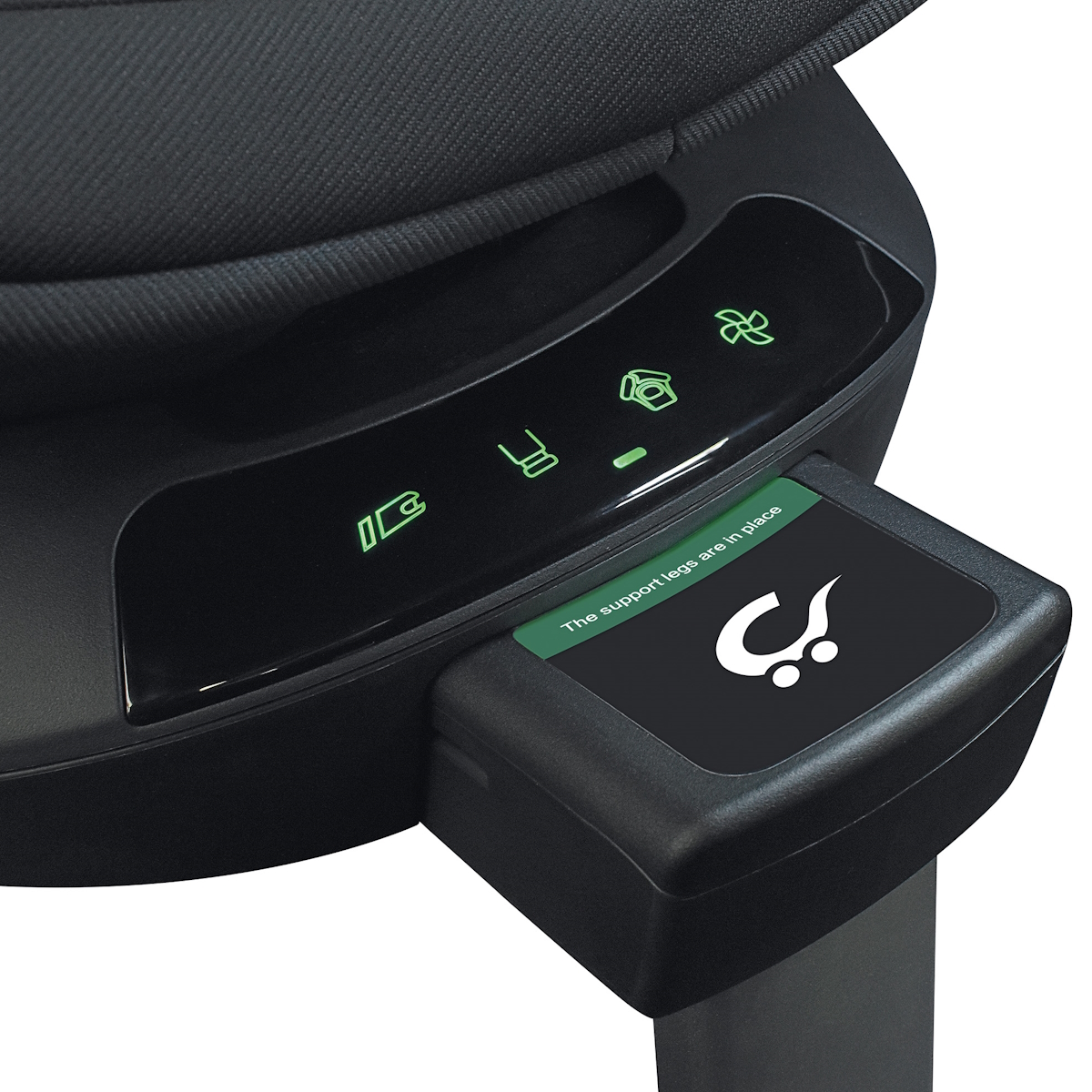 Sinalética luminosa: Indicando correta da fixação da ancoragem isofix ao automóvel, da correta regulação do pé de apoio, da correta fixação dos cintos da cadeira auto na zona entre pernas e ainda da indicação de funcionamento da ventilação das costas da cadeira auto.
