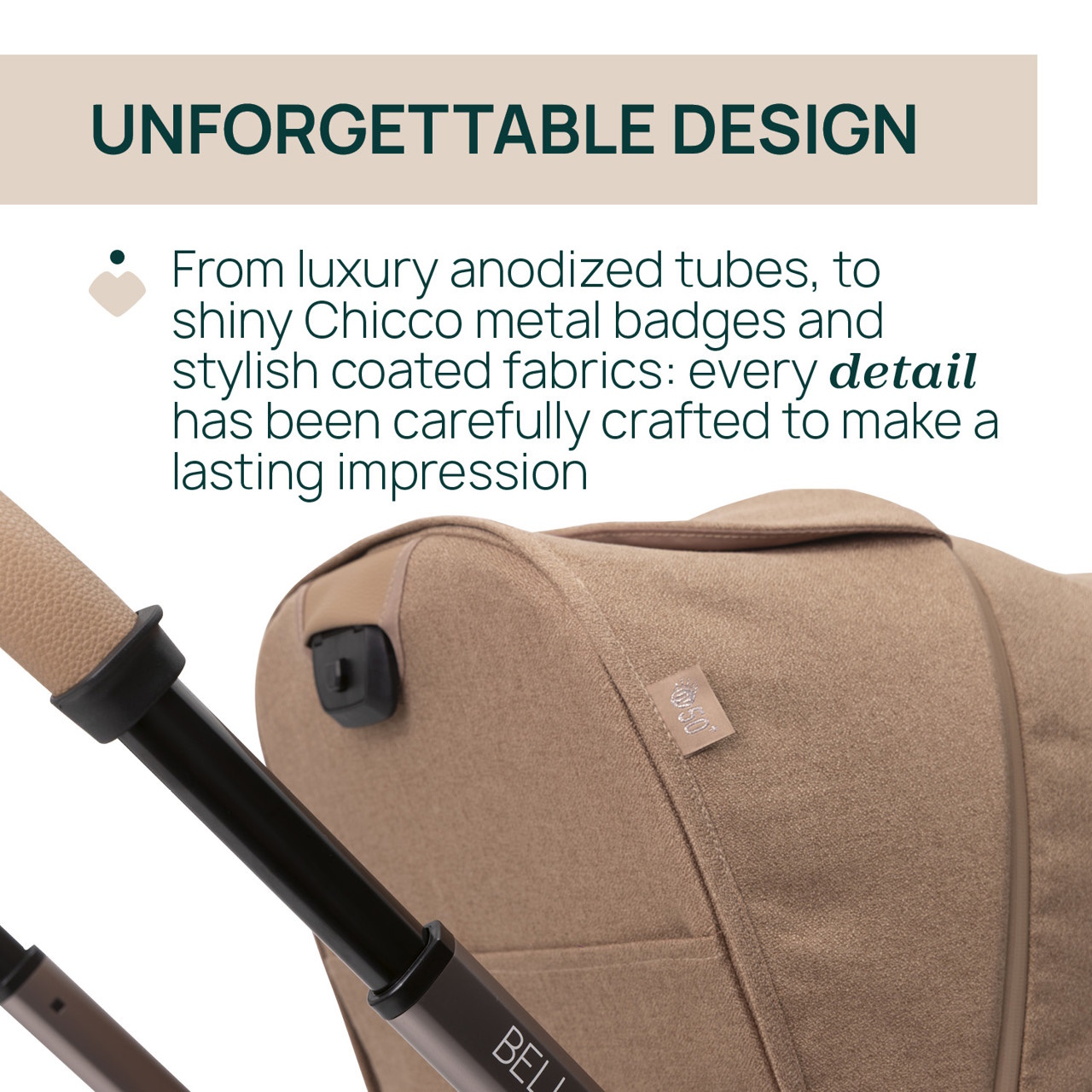 Prepare-se para se encantar com o design inesquecível do Bellagio: desde tubos anodizados de luxo a emblemas metálicos Chicco e tecidos revestidos, cada detalhe foi cuidadosamente elaborado para causar uma impressão duradoura. Assento elevado a 54 cm do solo.