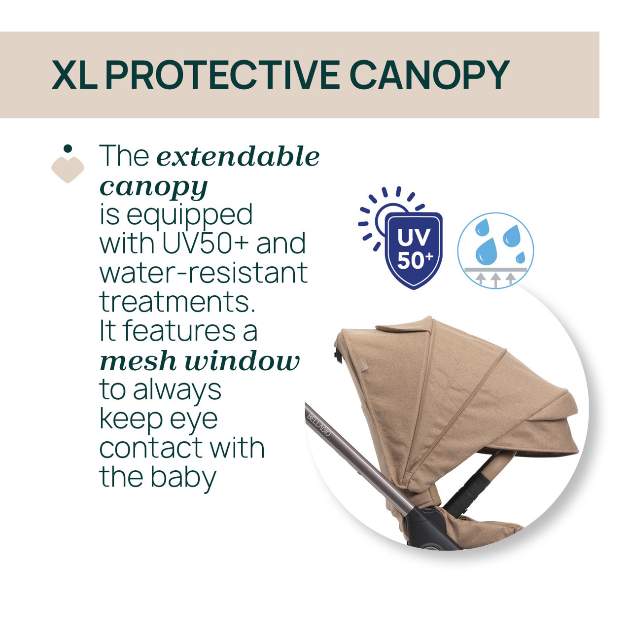 Capota de sol extensível, com proteção UV50+ e hidrorrepelente.