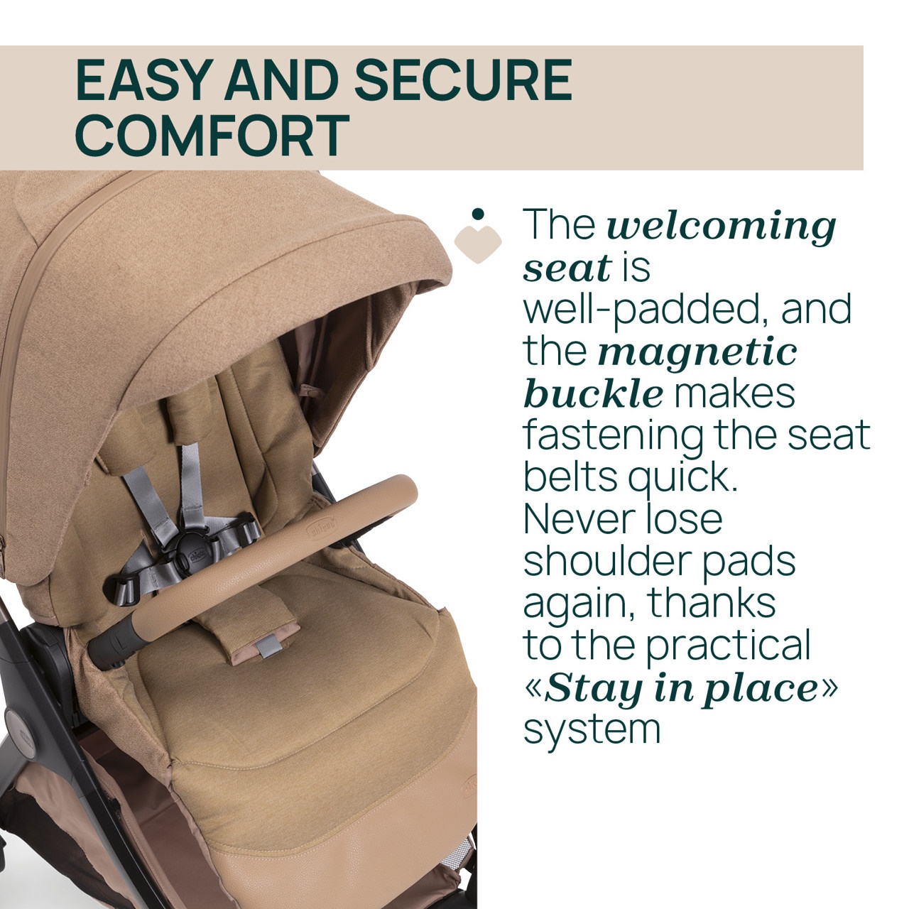 Para além da dobragem OneTouch, possui rodas de EVA + Borracha de alto desempenho, rolamentos de esferas e amortecedores emmtodas as rodas para o melhor conforto e manobrabilidade em todos os terrenos. A fivela magnética torna o colocar dos cintos rápido e fácil, e as almofadas dos ombros estão ligadas entre si, para que nunca mais as perca!
