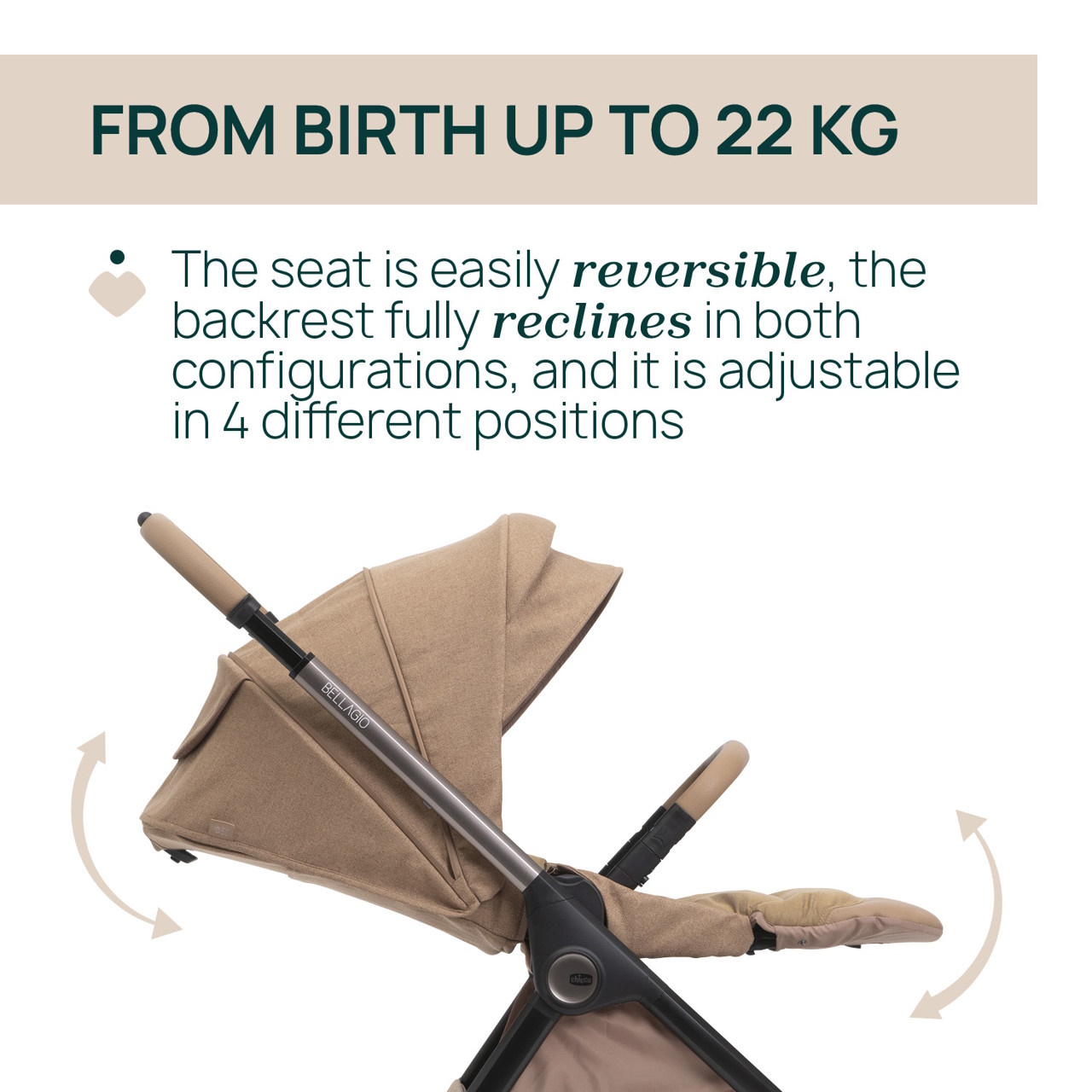 O carro Bellagio 2.0 é homologado desde o nascimento até aos 22 kg (aproximadamente 4 anos), graças ao encosto reclinável, reversível e ao apoio das pernas.