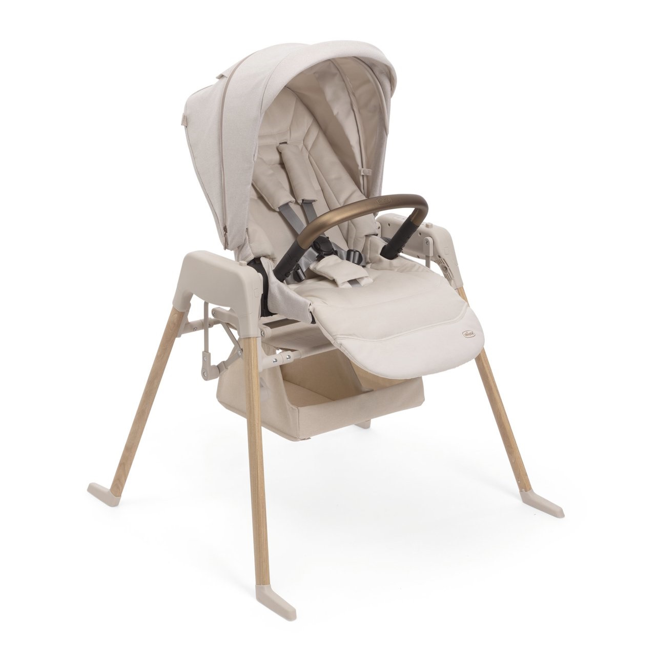 Grande cesto incluído para guardar tudo o que os pais precisam para cuidar do bebé, como chupetas, fraldas e toalhitas.