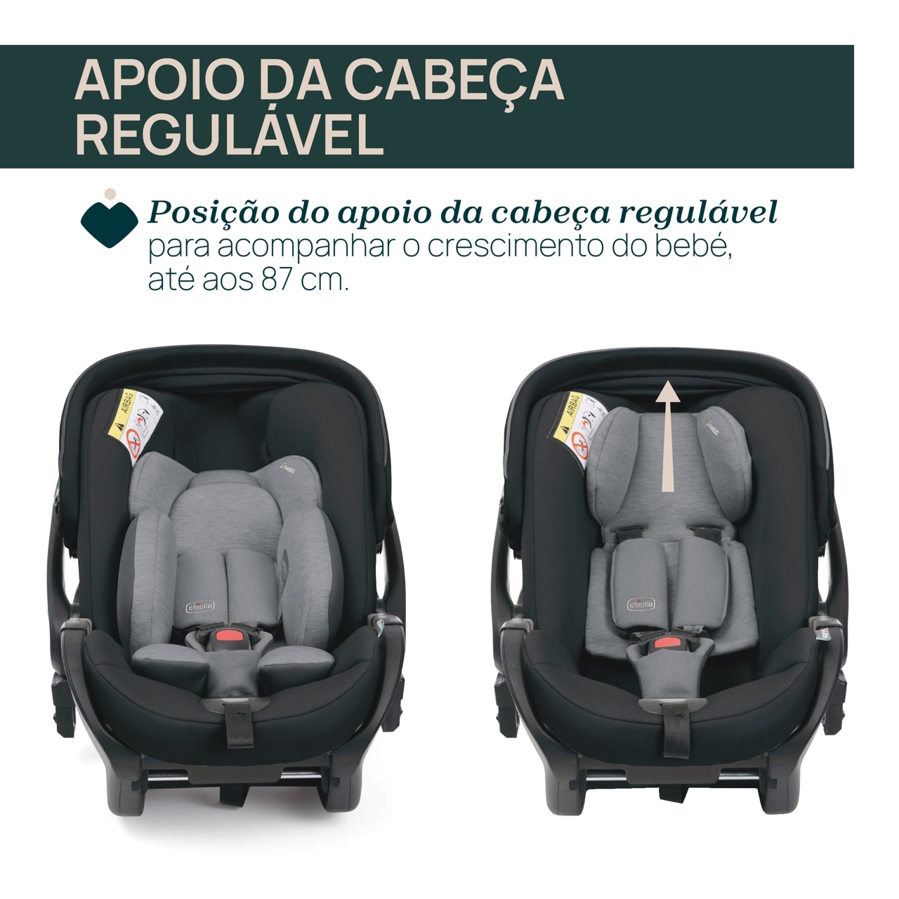 O apoio para a cabeça pode ser ajustado com uma mão, ao mesmo tempo que o sistema de cintos de segurança do automóvel, para acompanhar o crescimento do bebé até 87 cm.