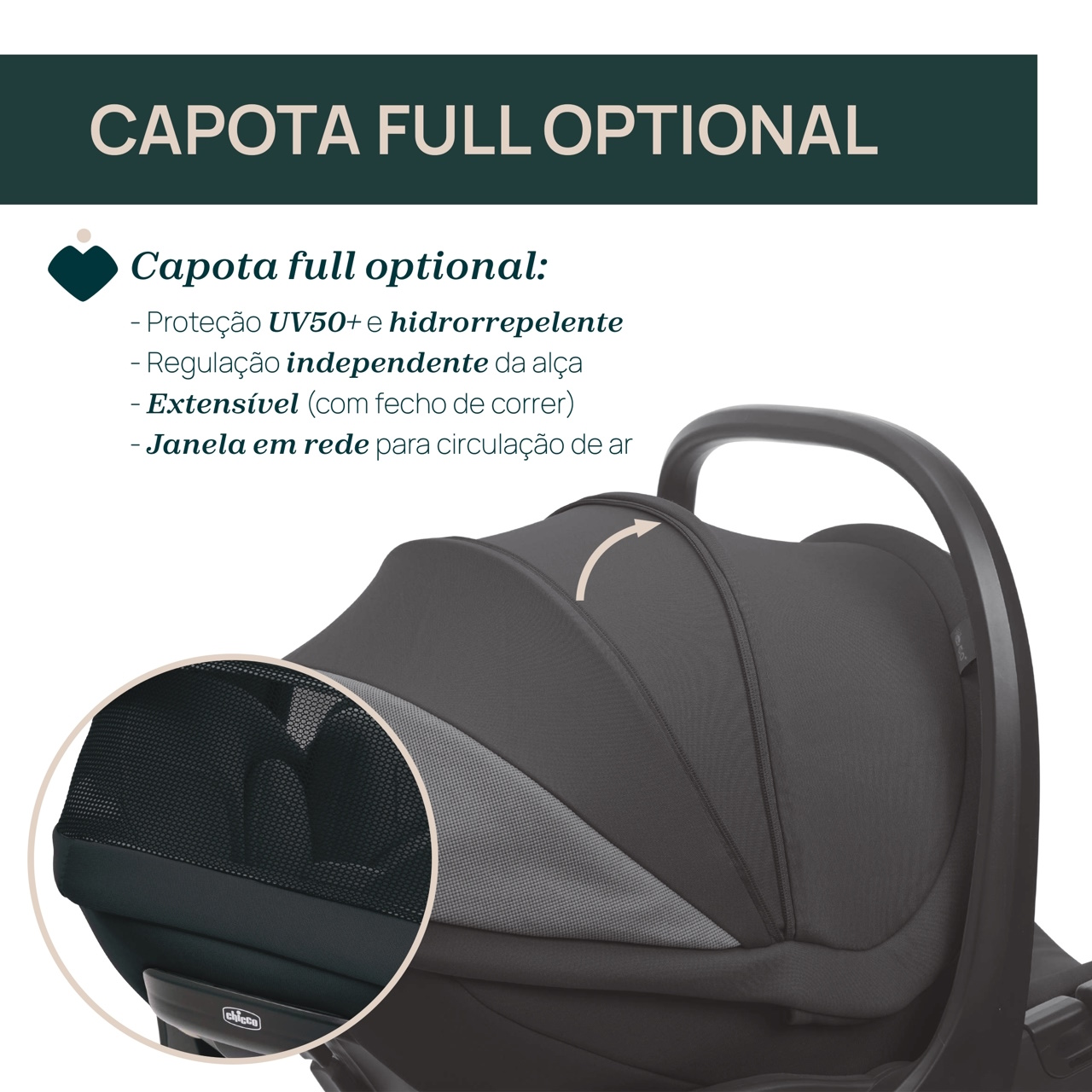 Capota com proteção UV50+ para proteger a criança dos raios solares, tratamente resistente à água e fácil de limpar. A capota pode ser regulada independentemente da pega. Além disso, possui um fecho de correr que permite alargar a capota para uma maior privacidade e uma janela para uma melhor circulação do ar.