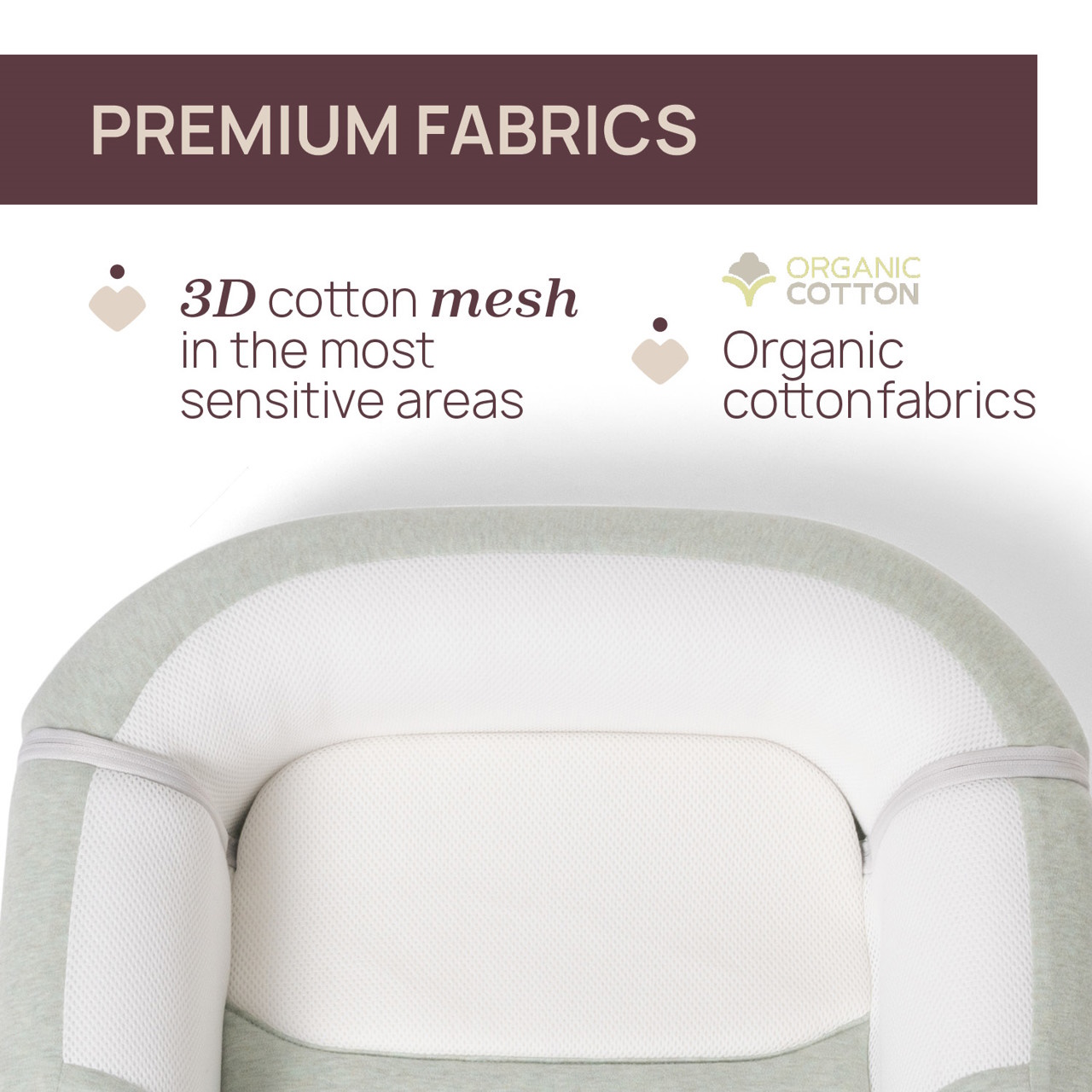Malha de algodão 3D: nas áreas mais sensíveis para evitar o sobreaquecimento e proporcionar ao bebé um ambiente de sono confortável.