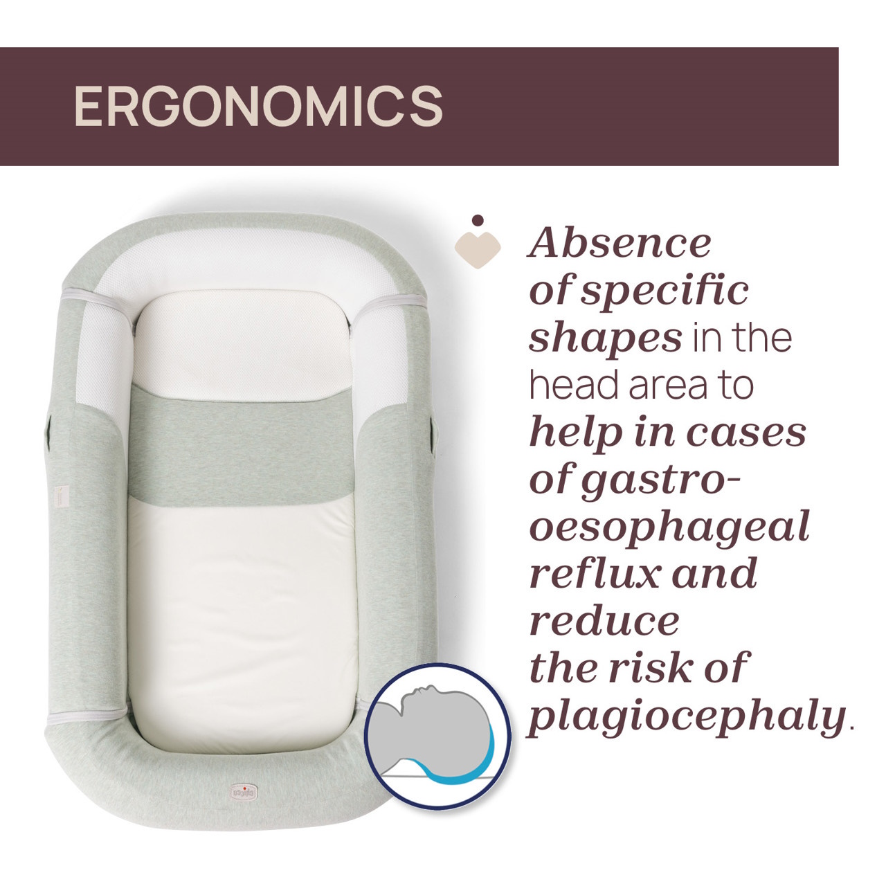 Solução ergonómica: a ausência de formas específicas na área da cabeça permite que a cabeça se mova livremente, o que é essencial em casos de refluxo gastroesofágico e reduz o risco de plagiocefalia.
