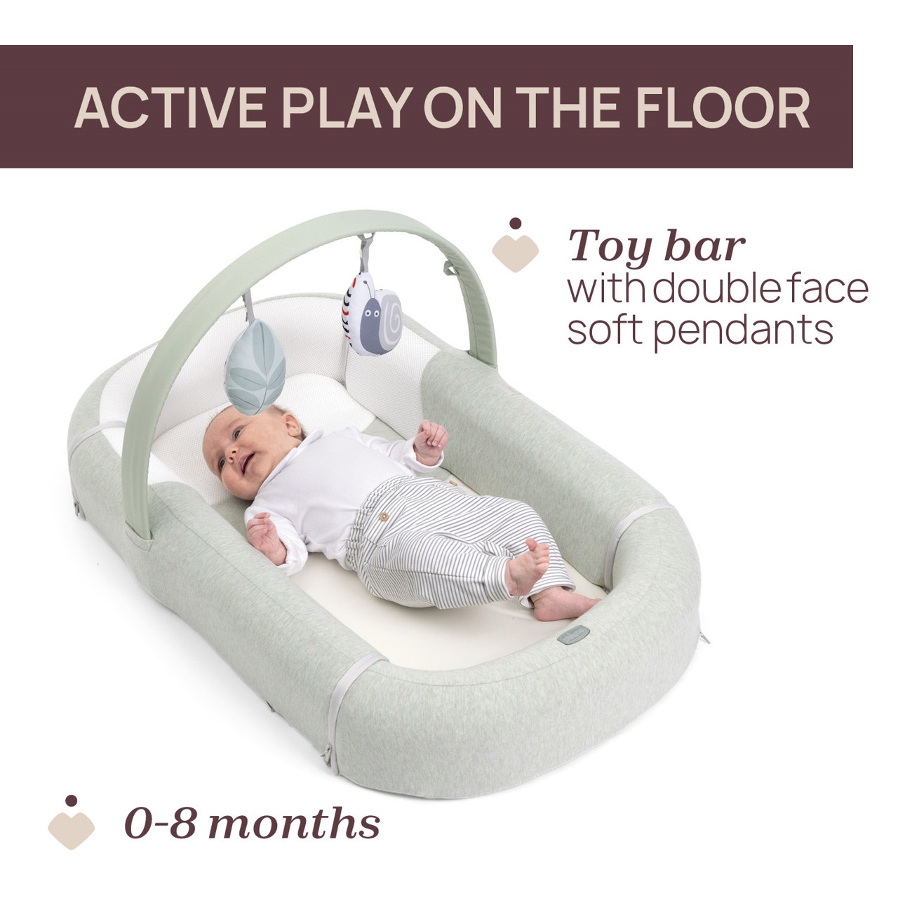 O Mommy Pod 4em1 vem com uma barra de brinquedos divertida e um insert especial concebido para apoiar o tempo de barriga para baixo, incentivando os mais pequenos a levantar a cabeça.