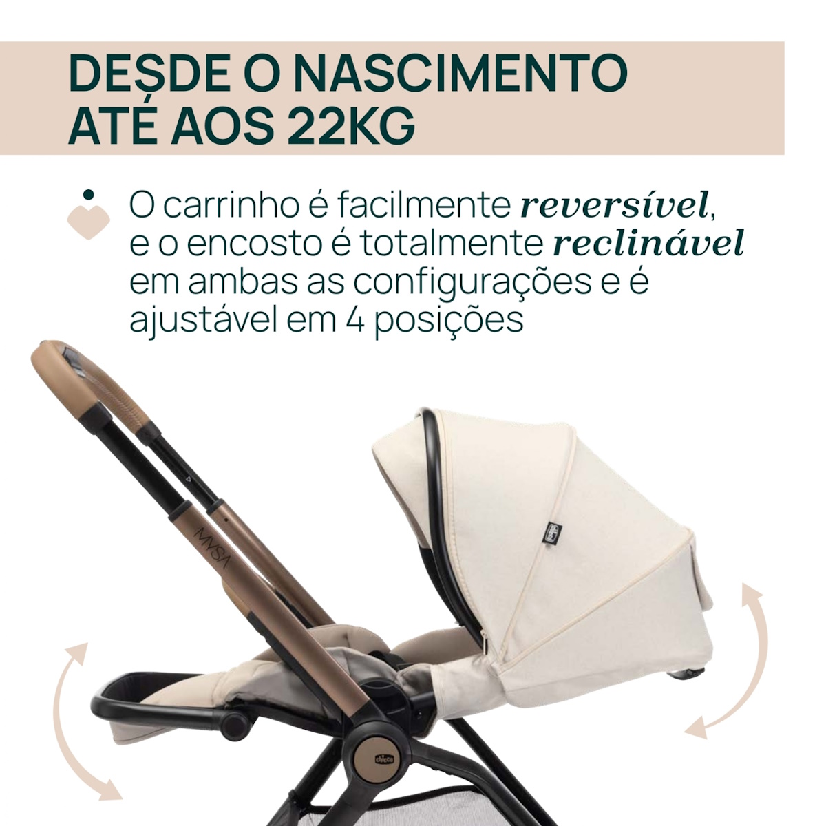 O Chicco Mysa é um carro de bebé premium, concebido para proporcionar bem-estar tanto aos pais como aos bebés, combinando funcionalidade superior com materiais de alta qualidade.