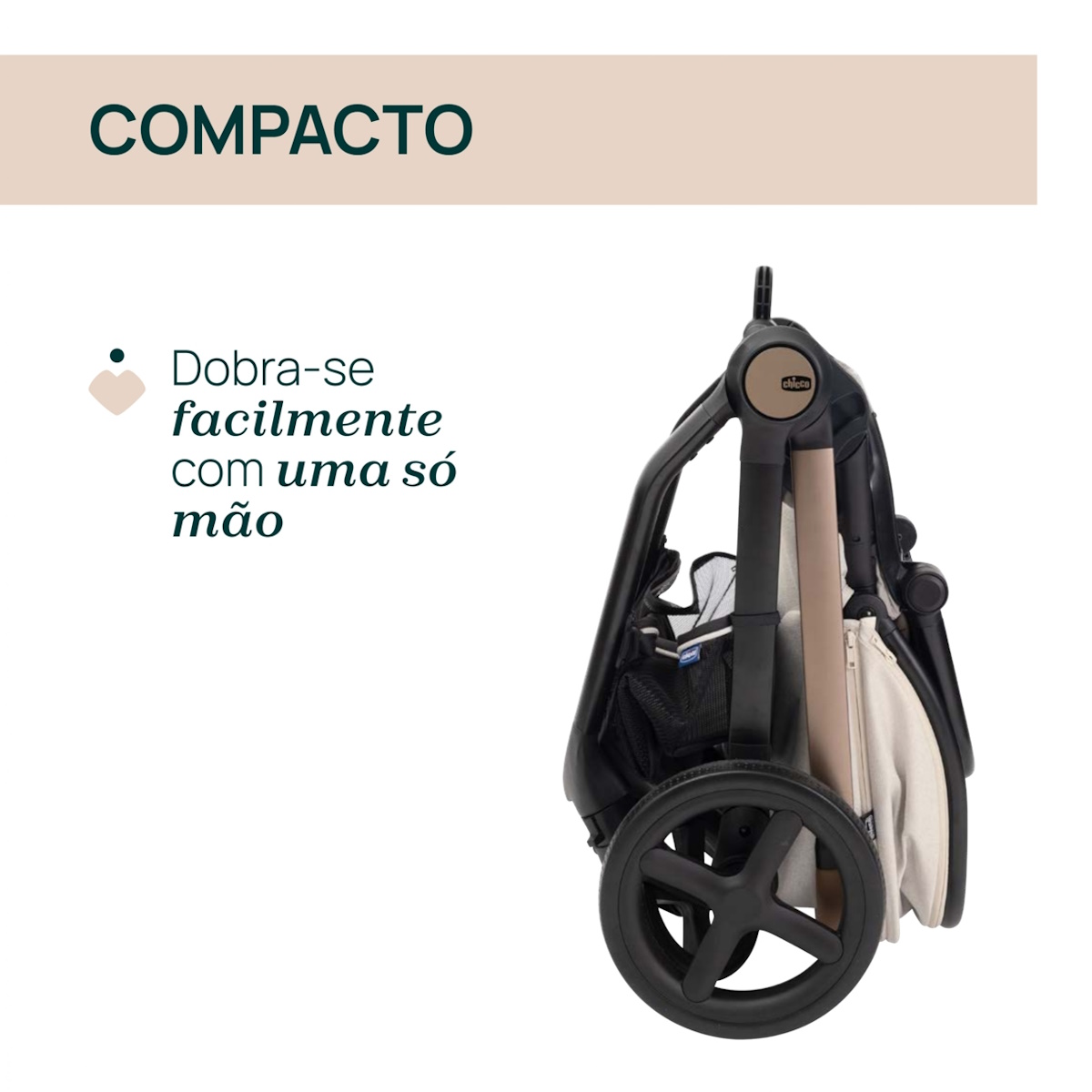 Dobragem com uma só mão, compacto e fácil de transportar. Condução ágil graças às rodas grandes em material resistente (EVA + borracha), com rolamentos de esferas e amortecedores em todas as rodas. A facilidade de uso estende-se também ao amplo cesto, à fivela magnética do arnés de 5 pontos e aos protetores das correias de ombros.