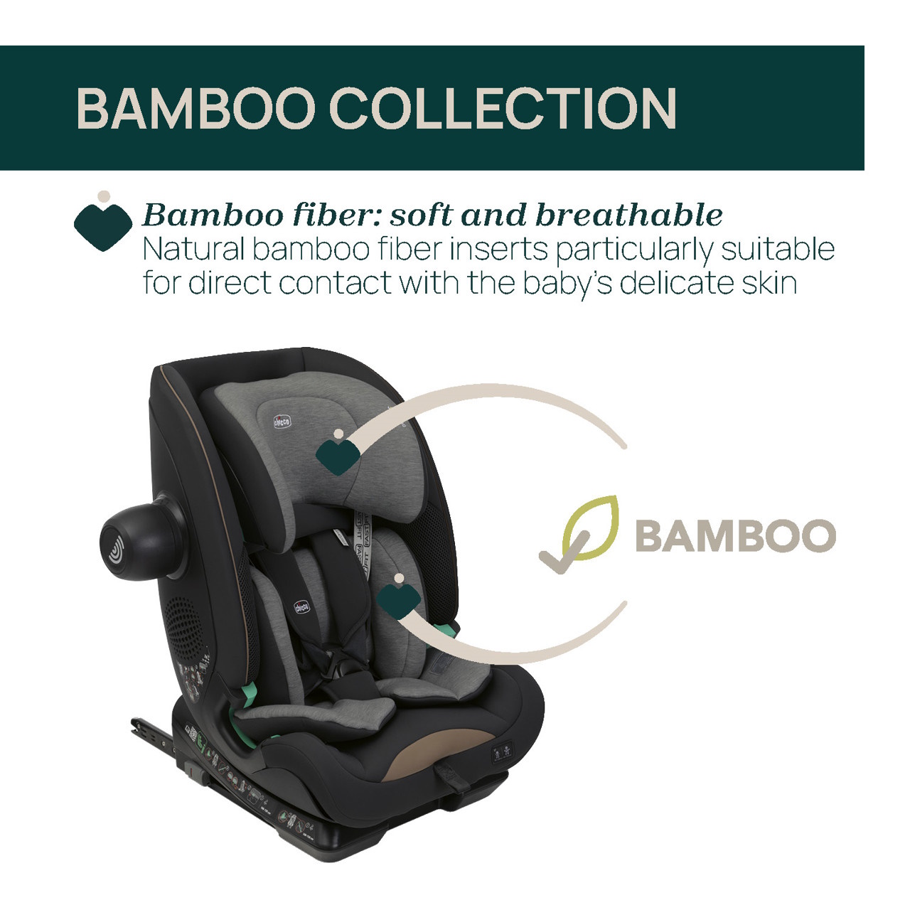 Fibra de bambu: macia e respirável: Apoio da cabeça e redutor revestidos em fibra de bambu: graças à sua suavidade, a fibra natural de bambu é particularmente adequada para o contacto direto com a pele delicada do bebé. Além de respirável, é capaz de absorver rapidamente e dissipar a humidade, ajudando a regular a temperatura natural da criança.