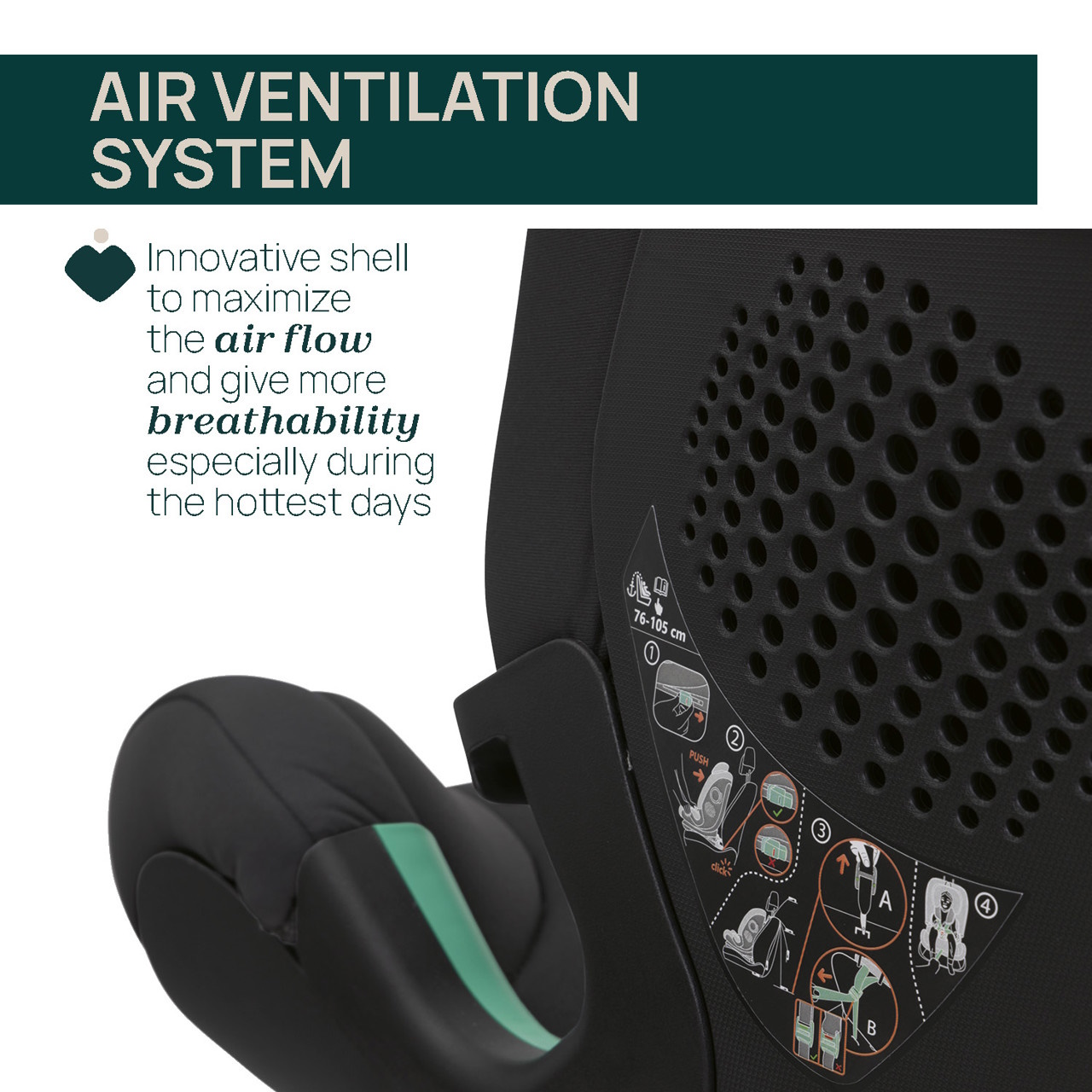 Sistema Fast-Fit: Sistema inovador composto por fitas elásticas que ajudam a abrir as correias do sistema de arnês de 5 pontos, mantendo-as abertas, sempre visíveis e facilmente acessíveis.