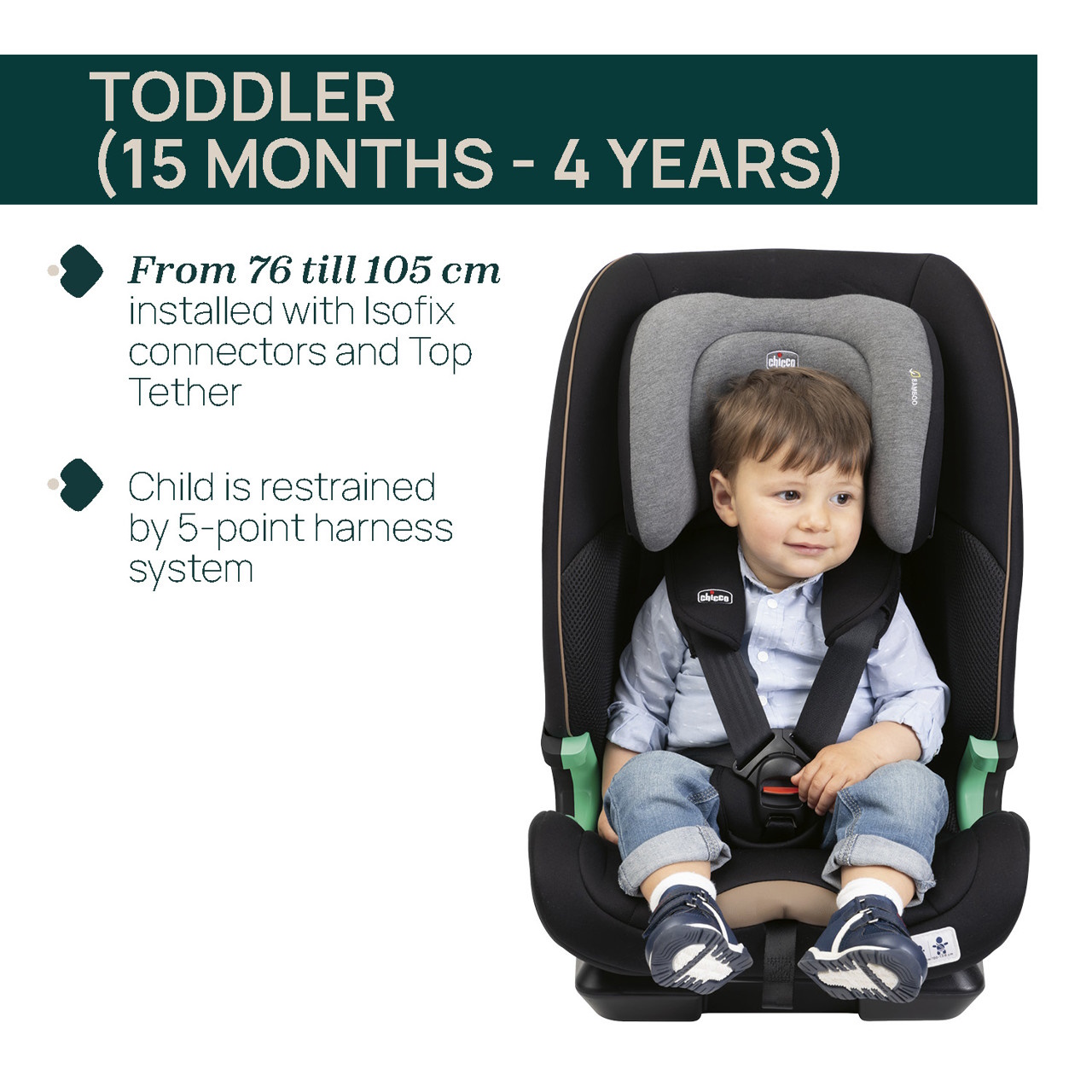 Sistema Isofix: A cadeira auto instala-se com conectores Isofix e Top Tether até aos 105cm, garantindo uma fixação fácil e rápida. A criança é retida pelo arnês de 5 pontos, dos 15 meses (e com altura mínima de 76cm) até aos 105cm (máximo 21kg).
