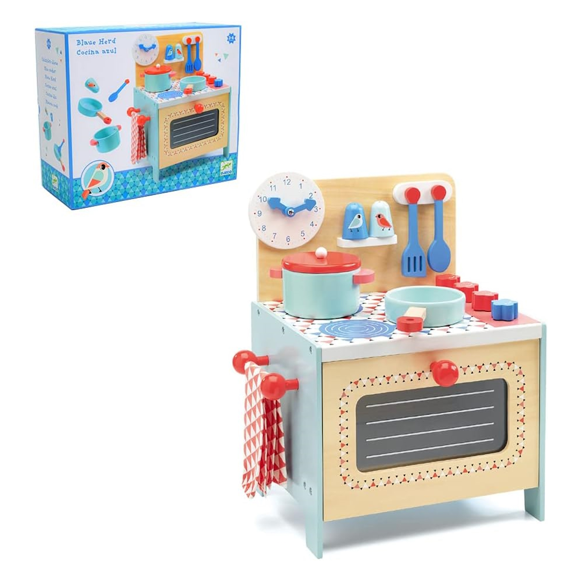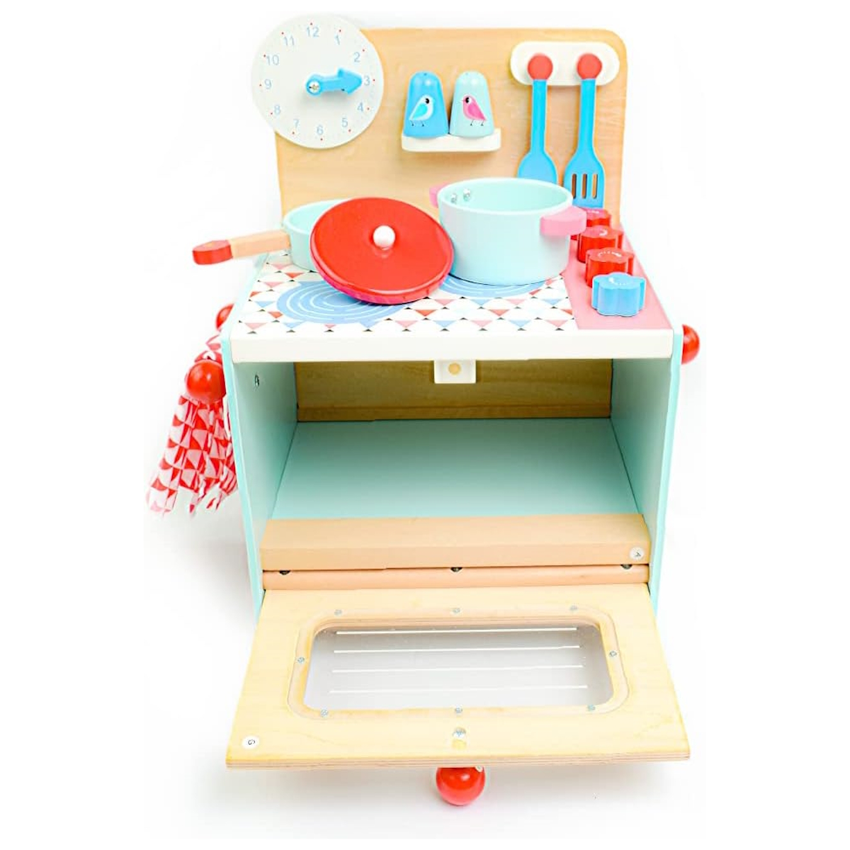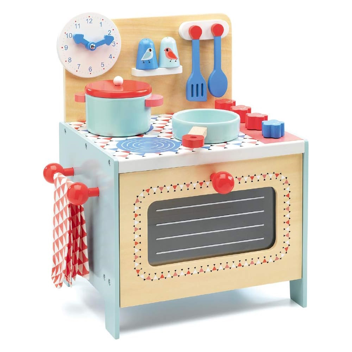 Cozinha fofa com forno e utensílios de cozinha para crianças em tons de pastel.