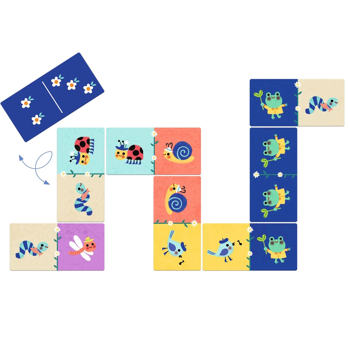 É um jogo de reconhecimento de imagens e aproximação aos números com o tema dos pequenos animais, apresentado numa bonita caixa cúbica facilmente transportável. Encontrará 28 dominós representando animais engraçados e, no outro lado, flores para indicar os números de 1 a 6.