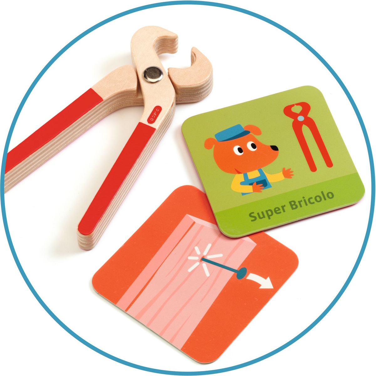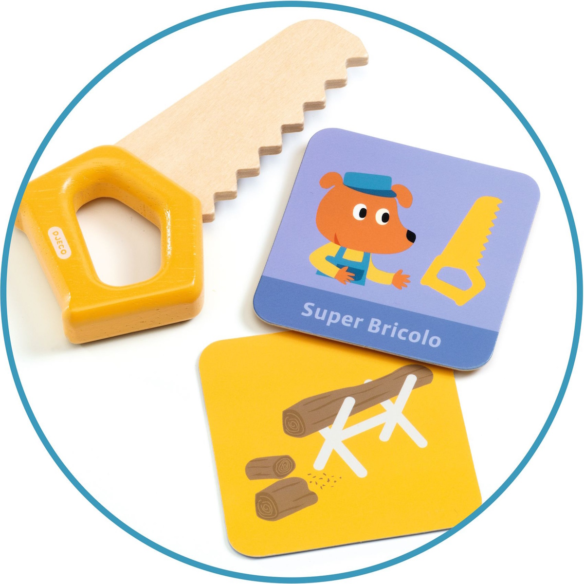 Cada cartão mostra algo que está partido e a ferramenta que o «Super Bricoleiro» precisa de usar para o consertar. Um jogo de encenação altamente educativo.