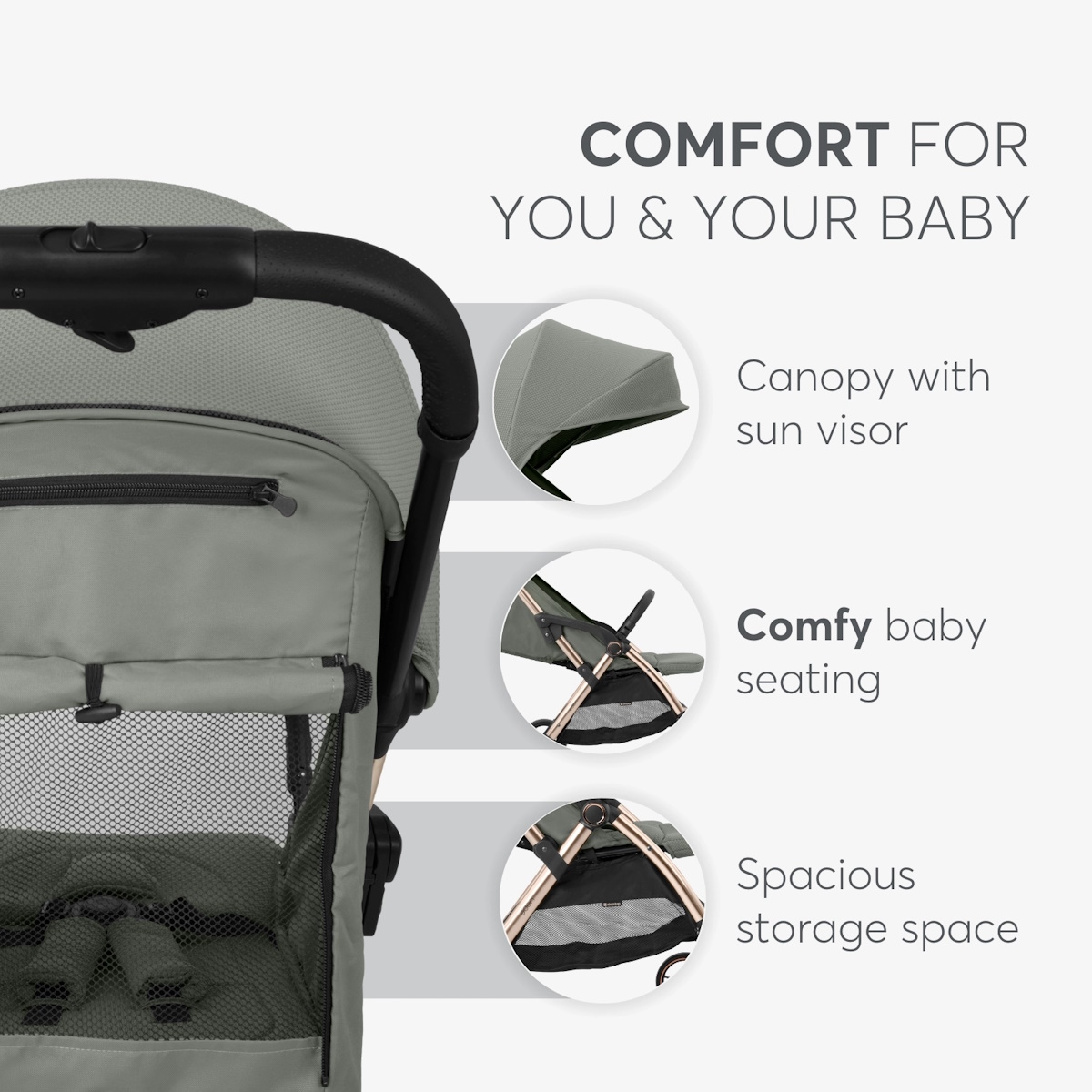 Mantenha todos os seus itens essenciais ao seu alcance com o grande compartimento de armazenamento, perfeito para guardar eficientemente os artigos do bebé, compras e itens pessoais.