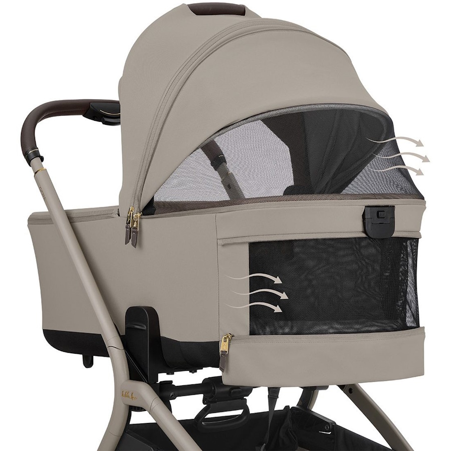 Assento reversível face mãe/face estrada e totalmente reclinável. Capota do assento extensível. Abertura do encosto do assento para arejamento. Colchão da alcofa com face inverno e face verão. Toldo integrado na alcofa. Aberturas em rede na cabeceira da alcofa para facilitar a ventilação. Cesto integrado no chassis suporta até 10 kg.