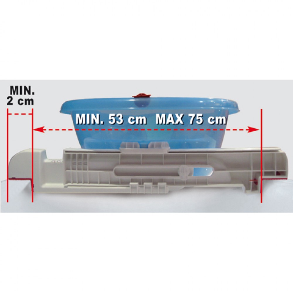 Este kit de suporte adapta-se sobre quase todas as banheiras para adultos do tipo padrão no comércio com uma distância interna compreendida entre o mínimo de 53 cm e o máximo de 75 cm. A beirada da banheira para adultos deve ter uma superfície de apoio plana mínima de 2 cm. (Ver imagens).