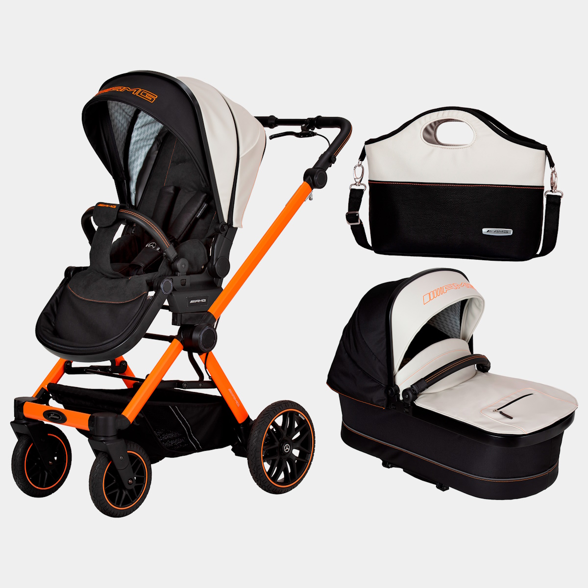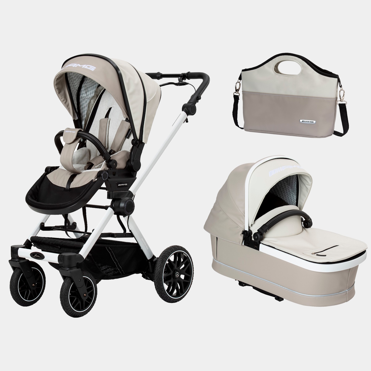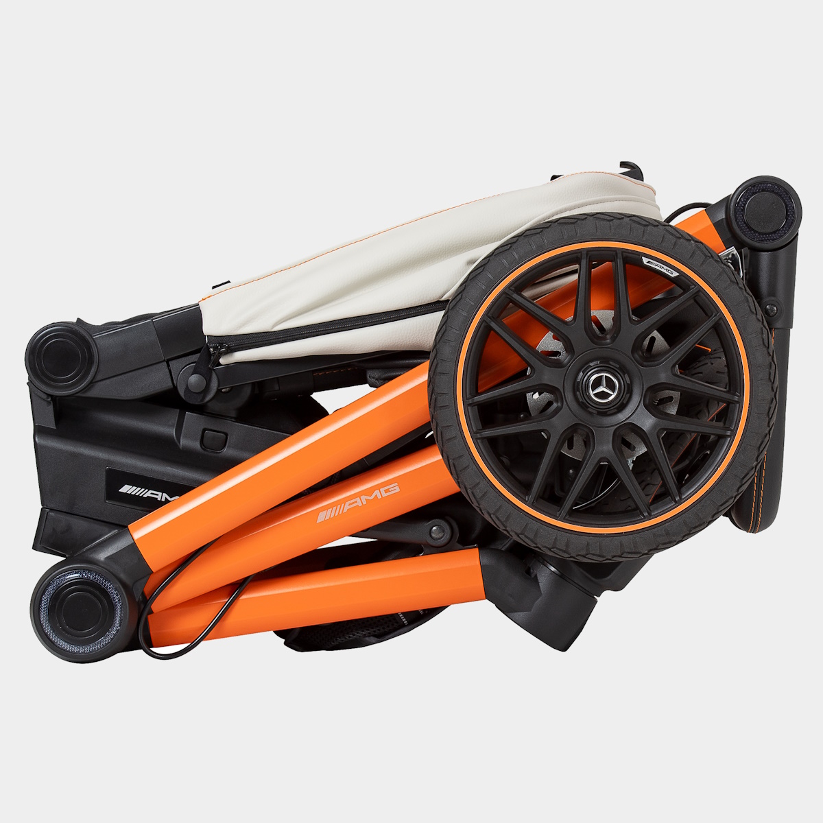 O AMG GT² é compacto quando dobrado. Com dimensões de dobragem de 69 x 58,5 x 31 cm, o AMG GT² e a unidade de assento dobram-se de forma ultra-compacta. Os designers fizeram um excelente trabalho. Apesar das dimensões de dobragem extremamente reduzidas, o carrinho de bebé AMG tem rodas giratórias, que se adaptam a qualquer terreno. Um destaque visual são as jantes “Trigon-Spoke” no design original AMG.