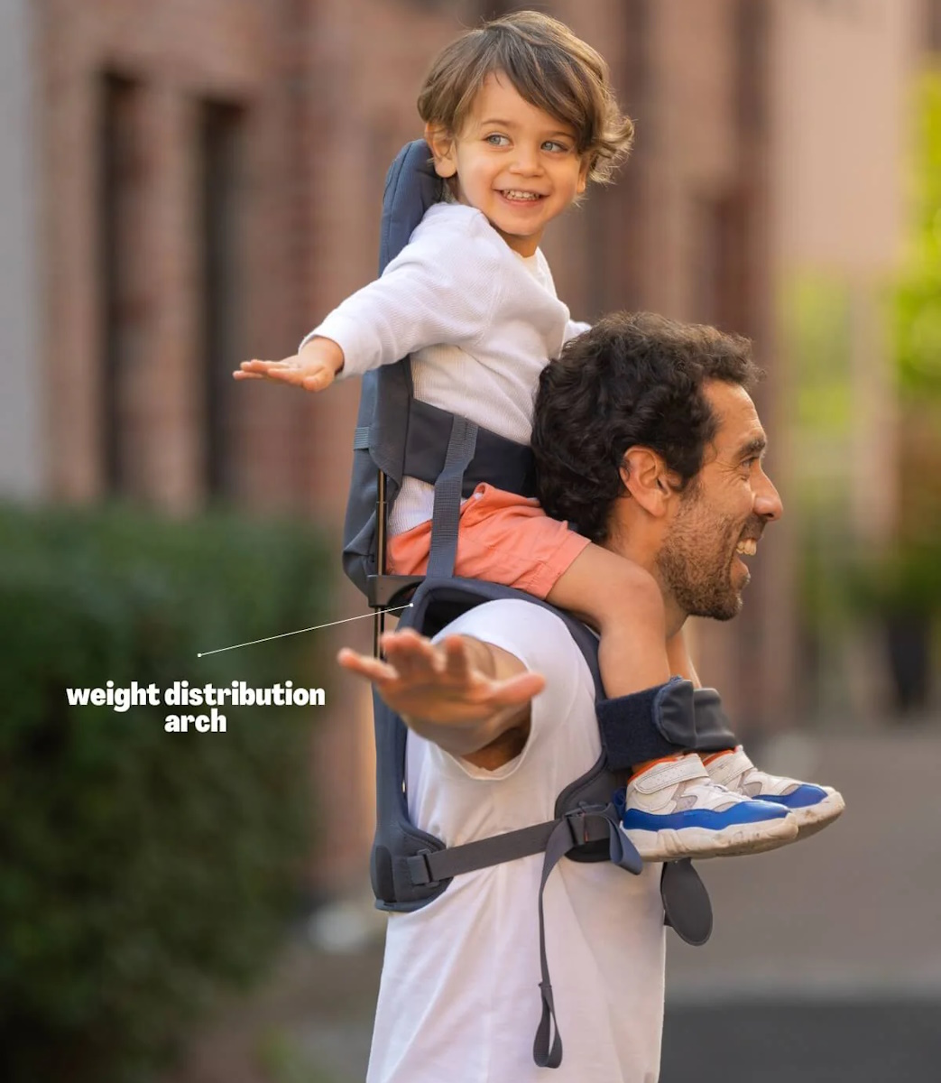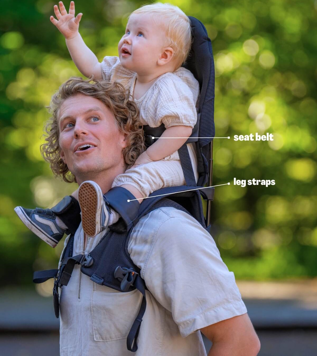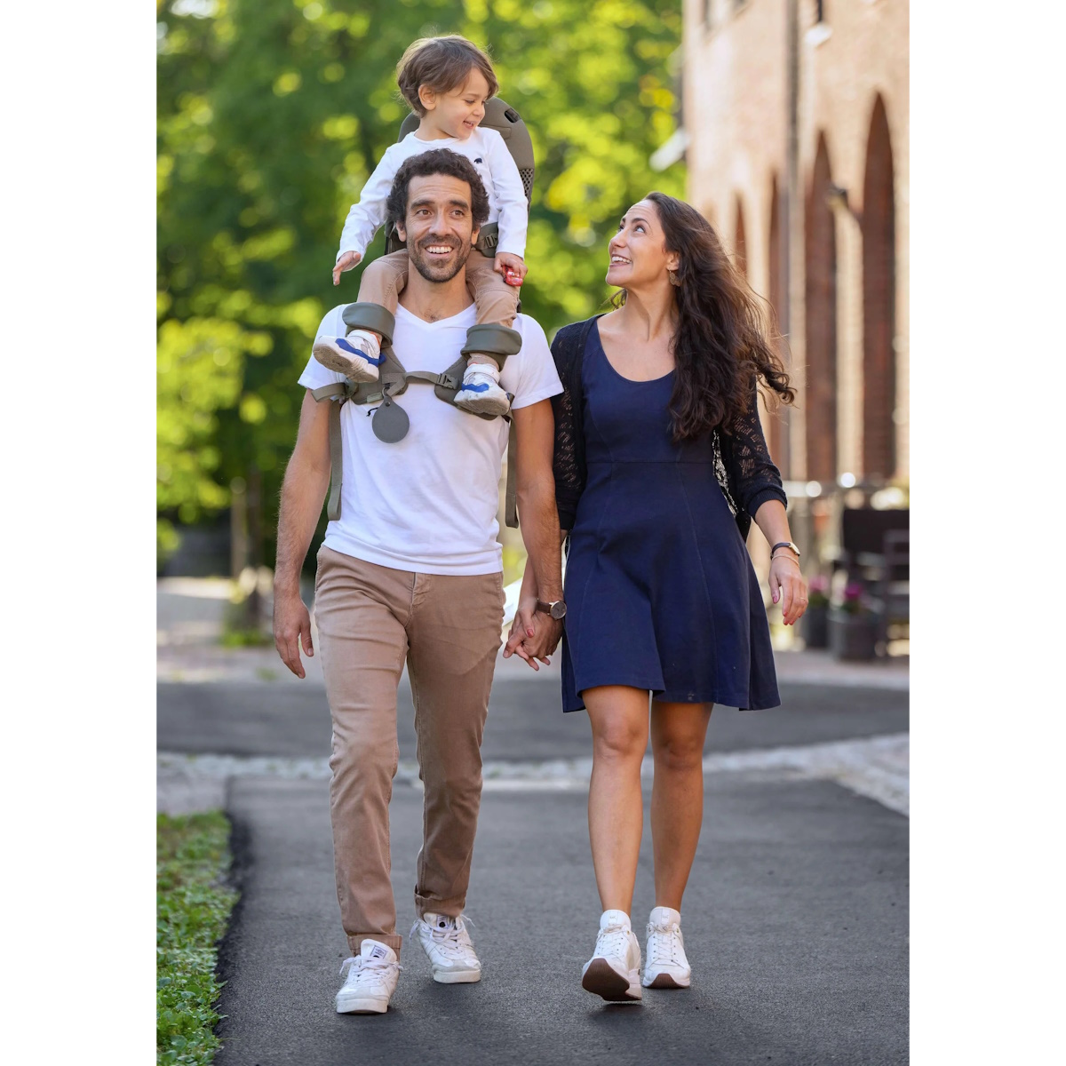 Enquanto descobre o mundo, o seu filho fica seguro nos seus ombros, preso por um cinto e correias para as pernas. Ambos com elegantes detalhes em pele sintética.