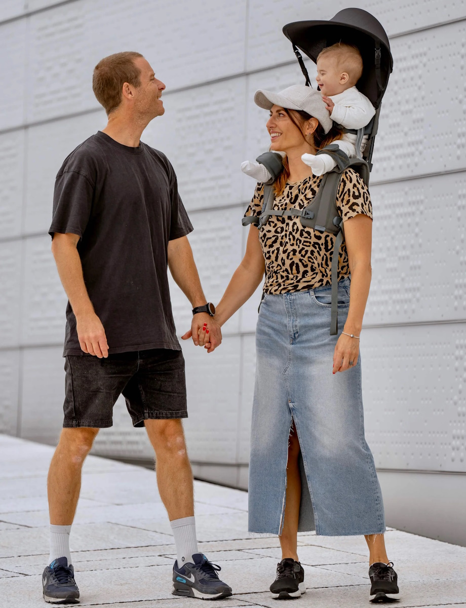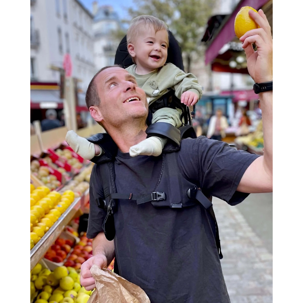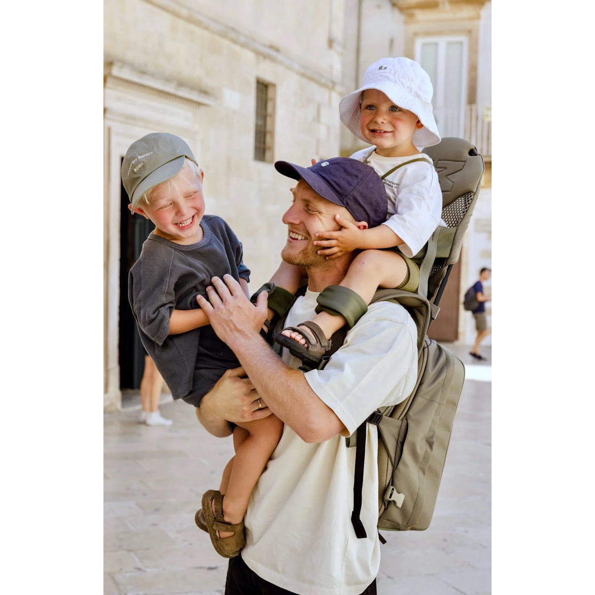Enquanto descobre o mundo, o seu filho fica seguro nos seus ombros, preso por um cinto e correias para as pernas. Ambos com elegantes detalhes em pele sintética.