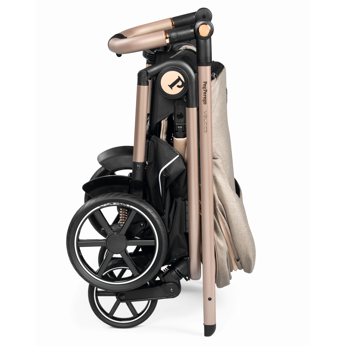 O carrinho Veloce abre e fecha com uma mão e com um único controle centralizado na alça para que você nunca tenha que se abaixar. Quando fechado te surpreende. O espaço fechado é mínimo com o assento enganchado em ambas as posições. É vertical e o assento do carrinho está sempre compacto e protegido para uma higiene ideal.