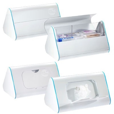 Prática e elegante, a DotBox possui dois compartimentos: um para toalhitas e outro lado para os pequenos acessórios essenciais para a jovem mãe, como cotonetes, termómetro, corta-unhas, solução salina fisiológica, supositórios, etc.
