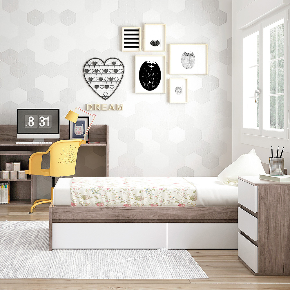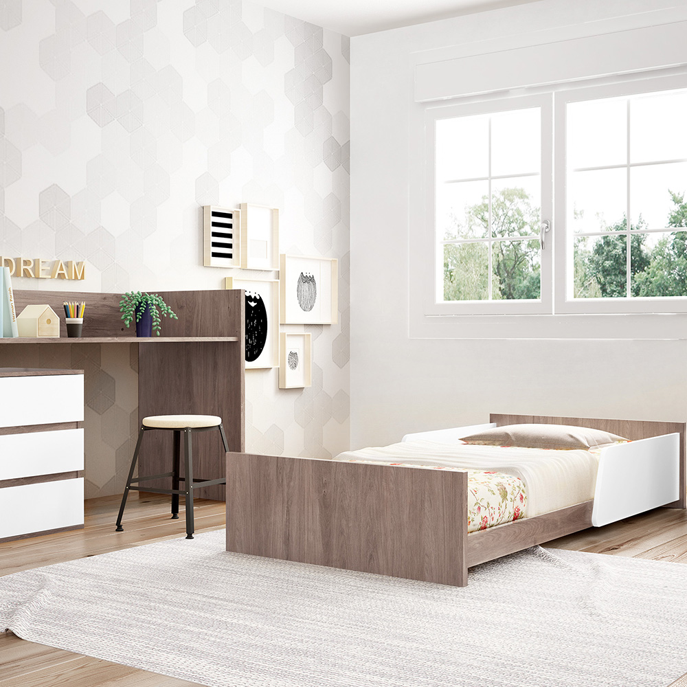 A Combi Cool é uma cama convertível com gavetas sem puxadores e um design muito especial, perfeito para evitar possíveis contusões, que se converte num quarto infantil com cama júnior, secretária, duas mesinhas e com opção de cama Montessori.